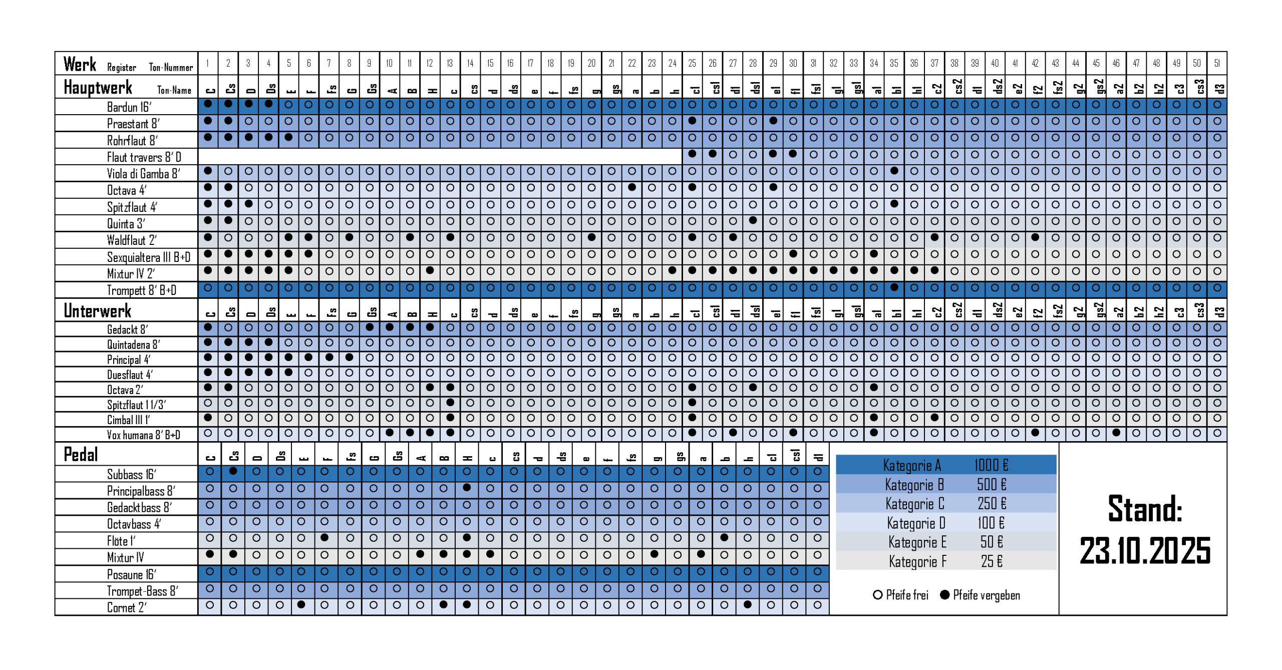 Die folgende Übersicht zeigt, welche Pfeifen bereits eine Patin oder einen Paten besitzen.